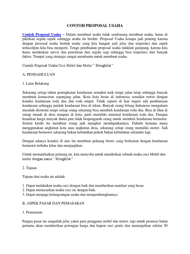 Dimana penulisannya harus secara sistematik dan. Contoh proposal usaha diperlukan sebelum kamu berencana memulai bisnis yang pendanaannya dari calon investor. Melalui proposal tersebut, kamu dapat mempersiapkan modal hingga peluang pasar lewat perencanaan yang matang. Proposal usaha dianggap sebagai cara yang ideal untuk merencanakan karier bisnis karena berisi hal detail mengenai berbagai aspek berhubungan dengan. Contoh proposal usaha termasuk ke dalam jenis proposal non formal.